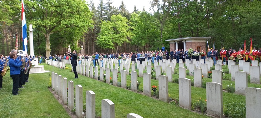 Onder grote belangstelling van burgers, militairen en Wapenbroeders spreken waarnemend burgemeester Han Looijen en kinderburgemeester Jur Roothans op 4 mei 2025 de aanwezigen toe op de Britse Begraafplaats. De noodzaak van stilstaan bij het hoogste offer dat de Britse militairen gaven voor onze vrijheid voelt iedereen meer dan ooit in deze tijd van oplopende conflicten en oorlogen. Na de Twee Minuten Stilte neigen leden van de eeuwenoude gilden de vaandels richting het monument voor de gevallenen. Het is een indrukwekkend moment dat wordt versterkt door het tromgeroffel.